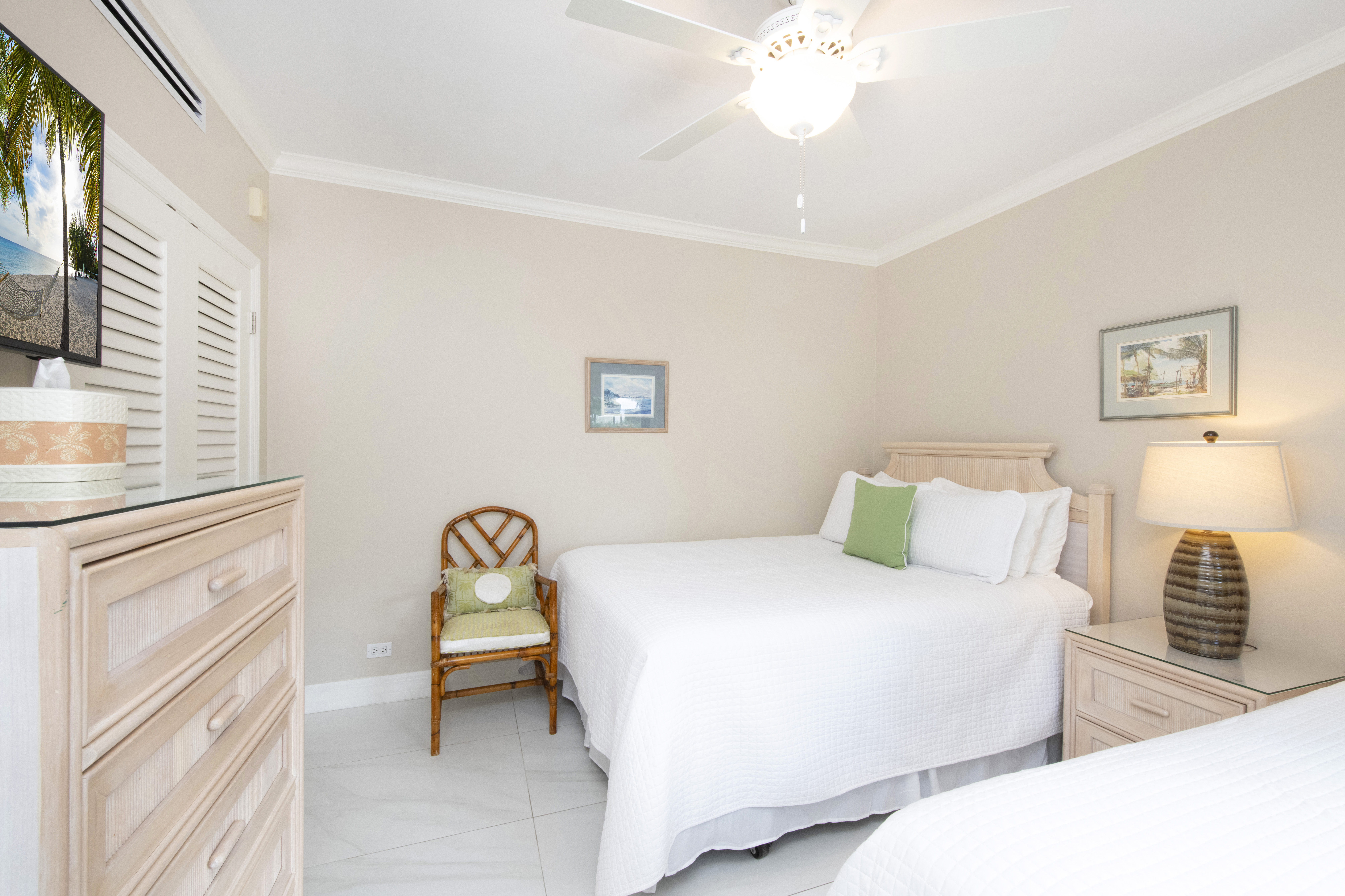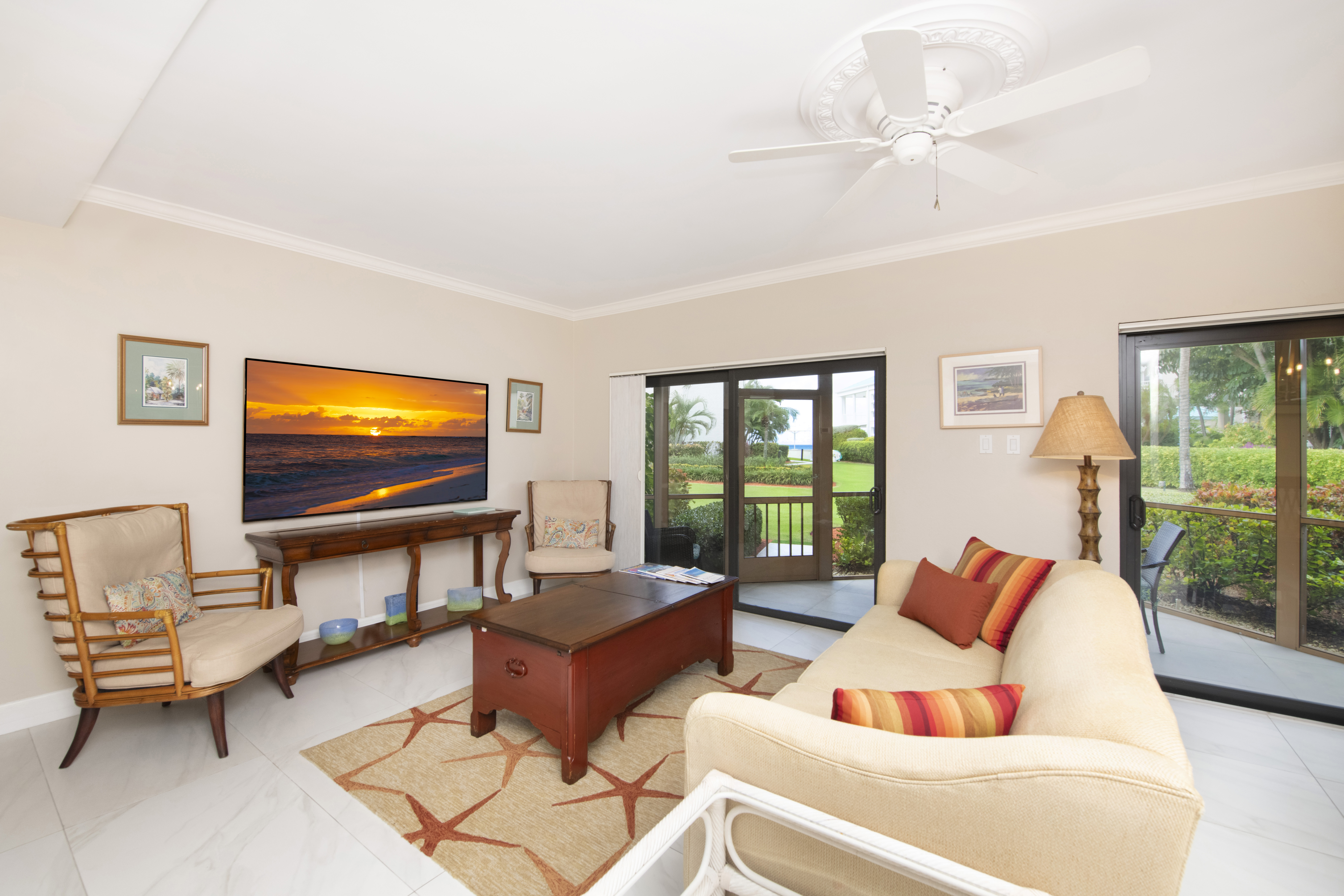 Ideally located, this 2 bedroom, 2 bathroom, ocean view condo is for those desiring more privacy. This ground floor condo offers garden and ocean views with the beach directly accessible through the screened lanai door and across an expansive lawn. The master bedroom has a king bed with bathroom en suite. The second bedroom has a queen bed and a twin bed. A roll-a-way bed, highchair or crib can be accommodated. Maximum occupancy: 4